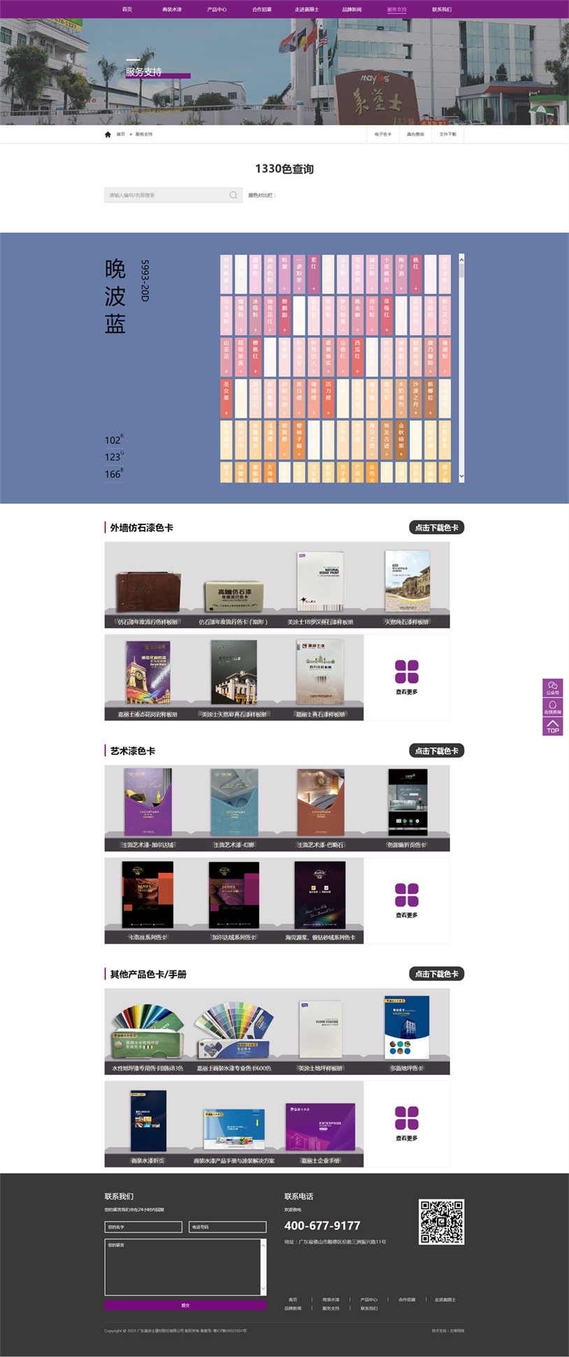 另外,為了方便各位用戶更快捷地了解我們的產(chǎn)品信息,新官網(wǎng)特別推出了電子色卡系統(tǒng)。在這里,用戶只需輸入產(chǎn)品的編號(hào)和名稱就可以查詢到對(duì)應(yīng)的顏色。同時(shí),我們還提供了外墻仿石漆、藝術(shù)漆、商裝水漆等核心產(chǎn)品色卡和手冊(cè)供用戶下載。