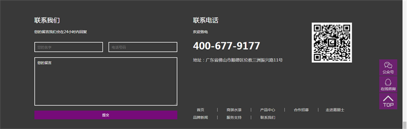 從網(wǎng)頁(yè)頂部導(dǎo)航欄“聯(lián)系我們”到底部增設(shè)的多渠道咨詢服務(wù),用戶可以從400服務(wù)熱線、在線咨詢、留言與我們聯(lián)系,我們將針對(duì)不同用戶的需求,打造專屬方案和服務(wù)。用戶還可通過(guò)手機(jī)掃描網(wǎng)頁(yè)底部的二維碼關(guān)注嘉麗士公眾號(hào),定期獲取嘉麗士最新資訊。此外,新官網(wǎng)還開設(shè)了合作招募通道,面向全國(guó)誠(chéng)招合伙人,攜手共建美好未來(lái)!