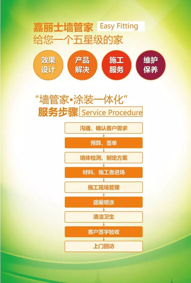 嘉麗士墻管家·涂裝一體化服務是嘉麗士針對消費者在墻面裝飾過程中提出的各項需求而制定的全方位墻面保護解決方案,一站式產品采購+一體化涂裝施工+管家式售后服務,極大地方便了消費者解決家居裝修中的墻面問題,因此得到了消費市場上的充分認可。