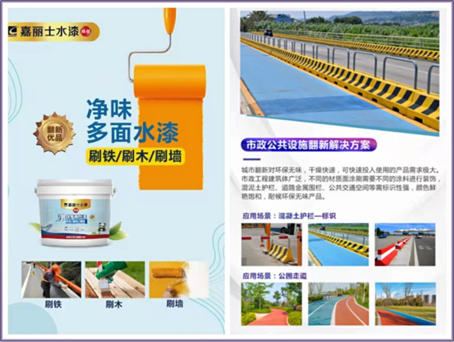 嘉麗士多面水漆,凈味環(huán)保、底面合一、遮蓋力好、可調(diào)千色、耐候耐水性能優(yōu)異,能在金屬面、木飾面、混凝土、墻面、PVC管道面等不同材質(zhì)表面上進行施工,可以輕松滿足城市更新改造的各項需求。