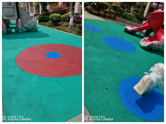 涂裝后的兒童游樂區(qū)地坪色彩鮮艷,藍、紅、綠搭配圓形圖案,充分展現(xiàn)了童趣,與周邊游樂設(shè)施一起,構(gòu)成了充滿夢幻童話的空間!