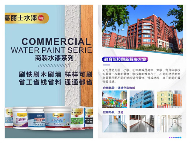 嘉麗士水漆專注于商業(yè)及公共空間涂裝和翻新業(yè)務(wù),產(chǎn)品凈味環(huán)保,施工過程不產(chǎn)生刺激性氣味,可實(shí)現(xiàn)分層分區(qū)域施工,不影響正常教學(xué)。施工簡(jiǎn)單、周期短。產(chǎn)品可調(diào)千色,色彩飽和度高,可實(shí)現(xiàn)校園豐富的色彩換新,打造夢(mèng)幻校園環(huán)境。