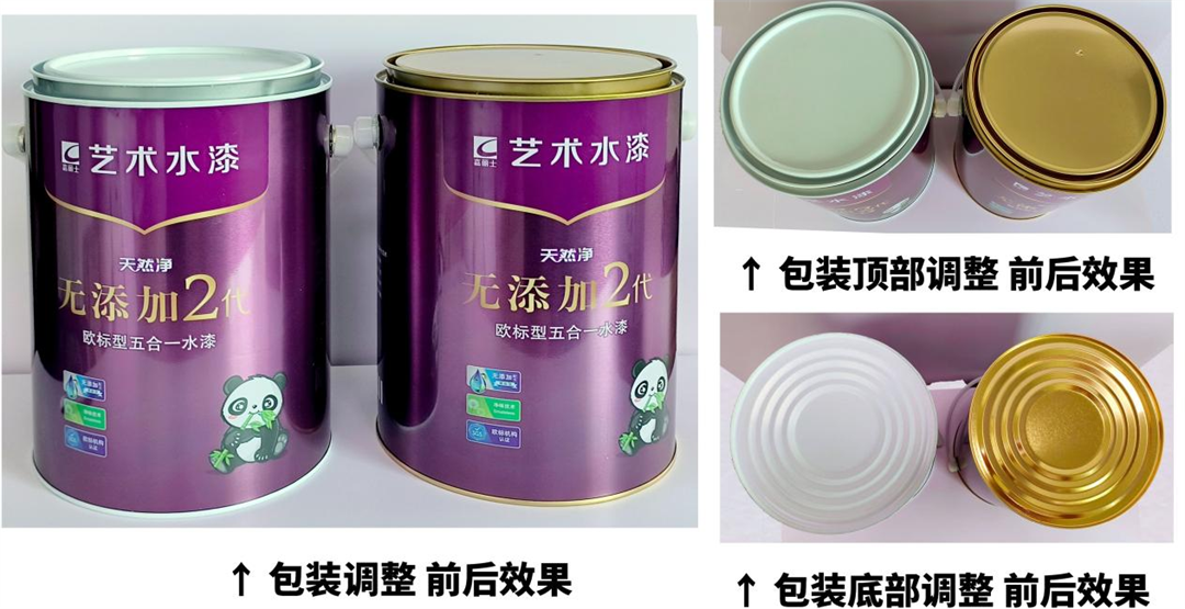 為進(jìn)一步提升5L內(nèi)墻乳膠漆包裝質(zhì)量,改善市場反饋的環(huán)口生銹問題,公司經(jīng)過近幾個(gè)月的產(chǎn)品熱儲、破壞性測試、竟品對標(biāo)分析及與供應(yīng)商的深入討論,于2025年4月22日起將5L乳膠漆包裝罐的底座、環(huán)口、桶蓋顏色由白色調(diào)整為金色。