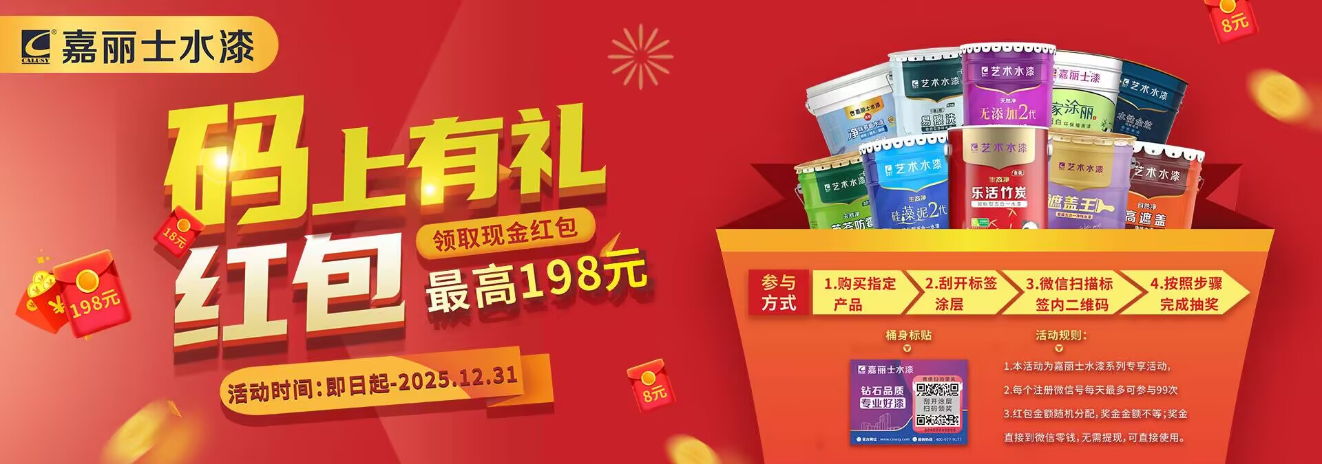 嘉麗士水漆 推出 “碼上有禮” 紅包活動(dòng),最高可領(lǐng)198元!不管是1.8 元、5.8元,38元,還是超級(jí)幸運(yùn)的198 元,每一個(gè)紅包都是嘉麗士水漆對(duì)大家的誠(chéng)意與回饋。