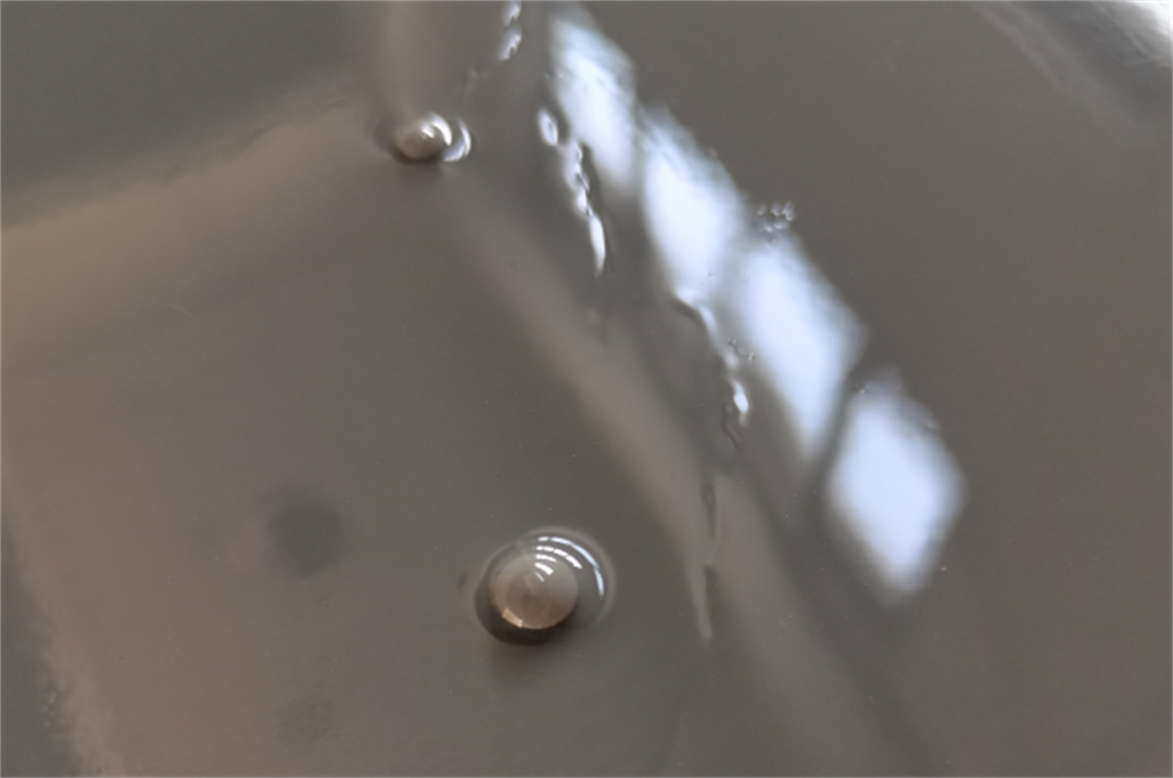表現(xiàn)為漆膜中存在著類似于針刺成的細(xì)孔。主要因?yàn)榈仄浩嵬苛现械臍怏w能透過涂膜釋放到涂層外,但溶劑已基本揮發(fā),涂料黏度過高,氣泡造成的小孔已無法自動(dòng)消除。