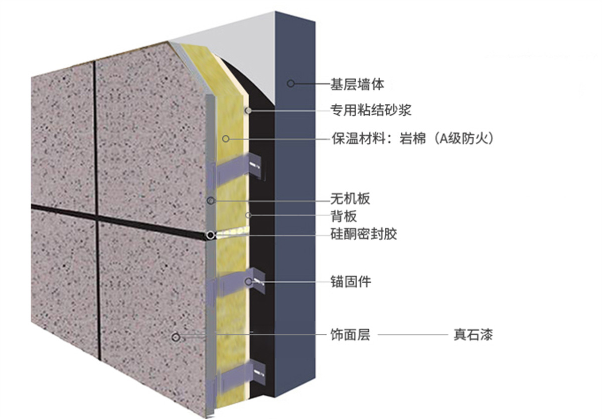 真石漆保溫裝飾一體板選用高密度、高強度A1級無機板為基材,通過精砂、滲透封閉、界面處理、飾面噴涂(輥涂)、固化、養(yǎng)護、復(fù)合等多道現(xiàn)代化生產(chǎn)工序加工成型。真石漆飾面表面層厚實,具有真實的自然色澤、質(zhì)感,給人以高雅、和諧、莊重之美感。